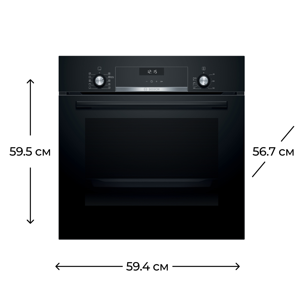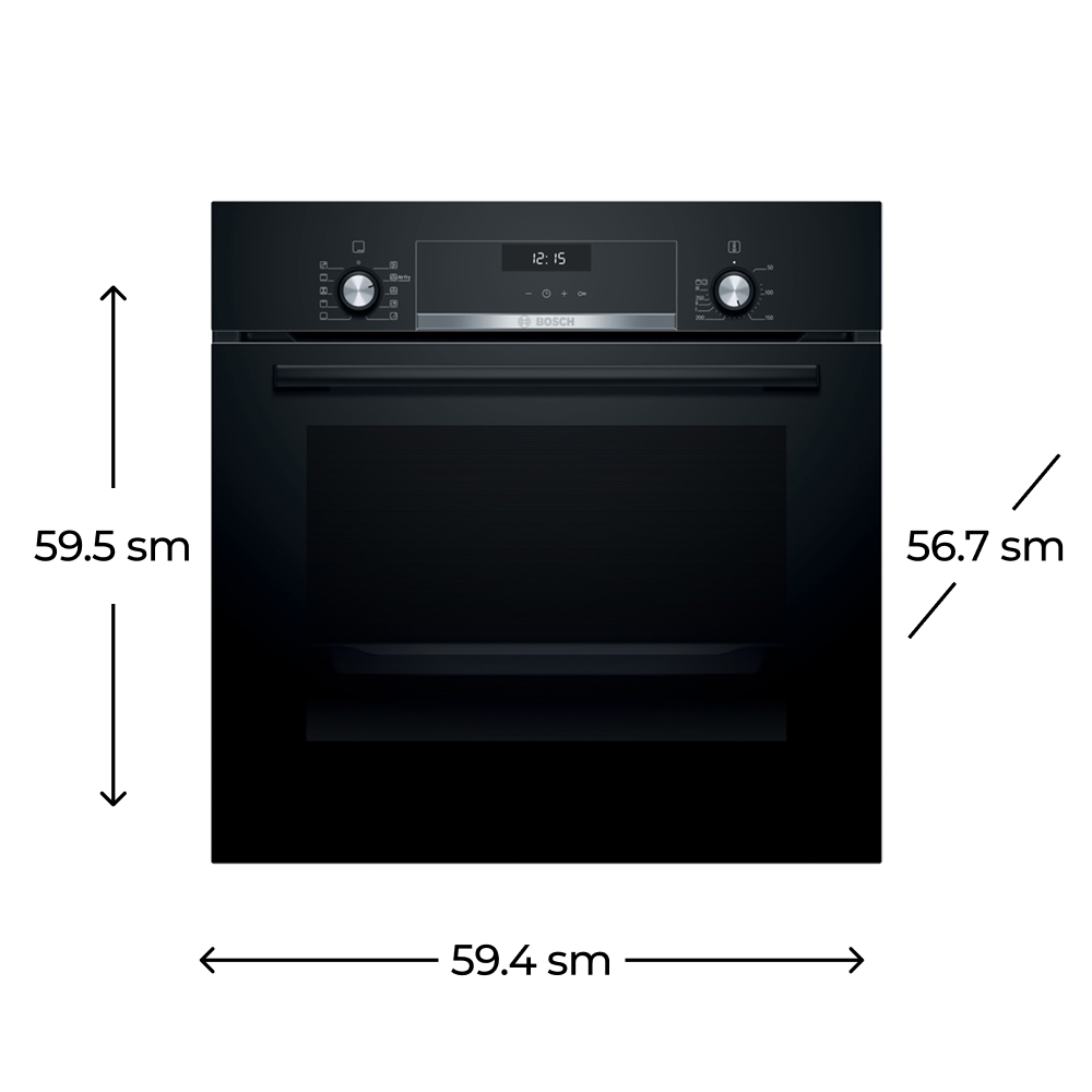 Bosch HBJ558YB3Q sobasının qapısında üçqat şüşə istifadə olunub ki, bu da həm istilik izolyasiyasını, həm də təhlükəsizliyi təmin edir. Quraşdırma üçün nəzərdə tutulan ölçülər: hündürlük 57.5–59.7 sm, en 56–56.8 sm, dərinlik 55 sm. Bu ölçülər onun mətbəx mebelinə problemsiz uyğunlaşmasına imkan verir.